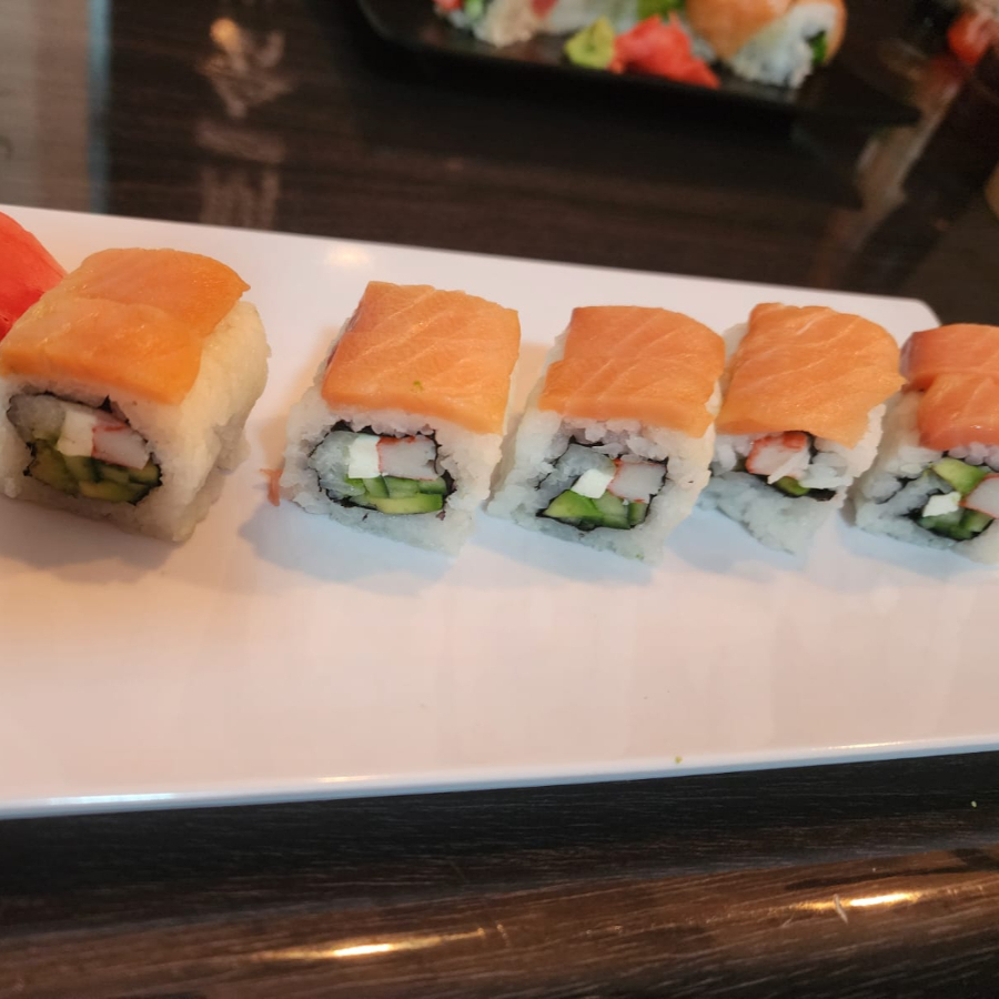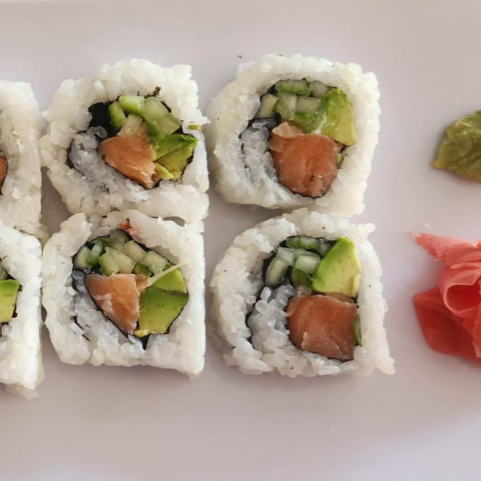 Arroz por fuera, salmón fresco, aguacate y pepino por dentro.