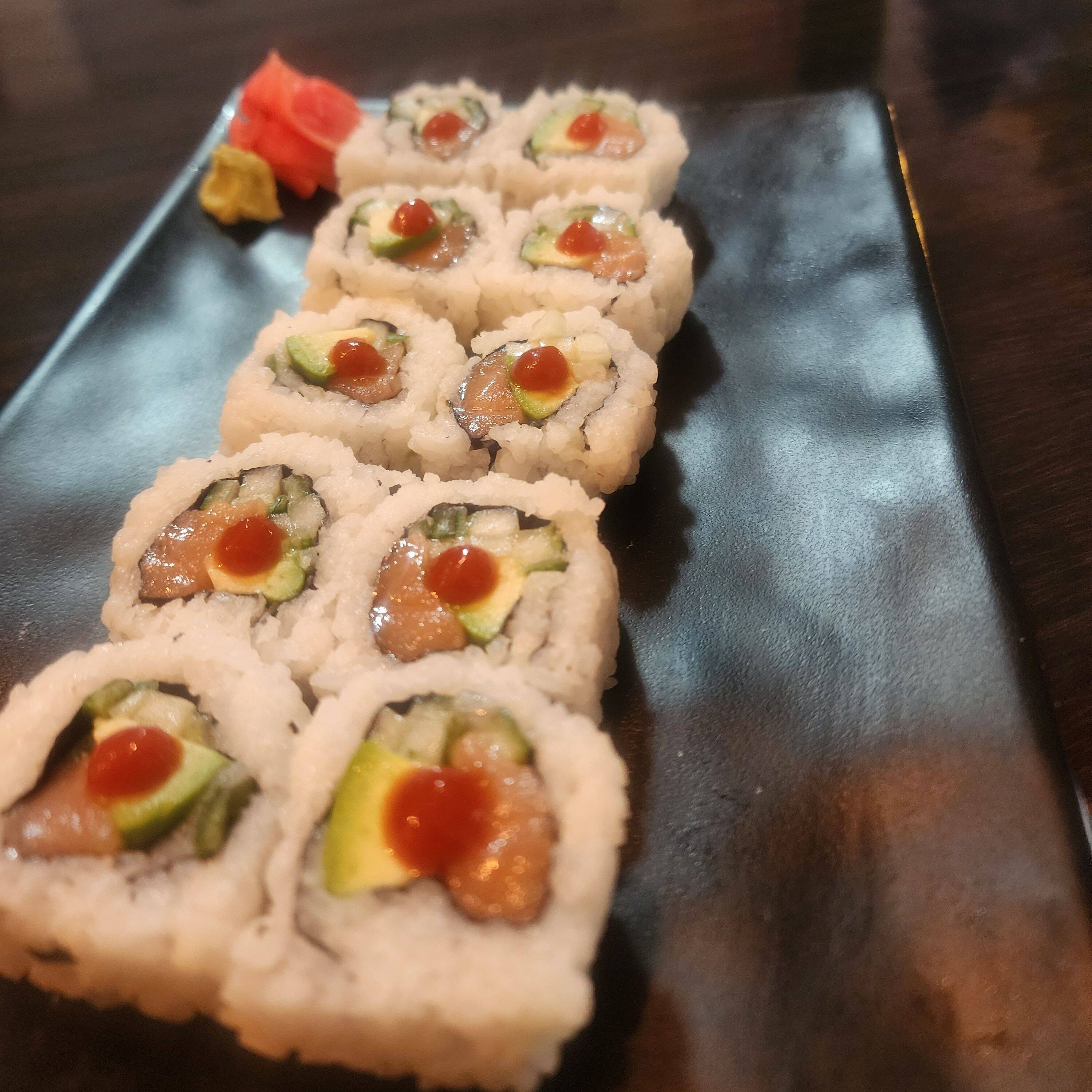 Arroz por fuera, salmón fresco, aguacate y pepino por fuera y unas gotas de sriracha.