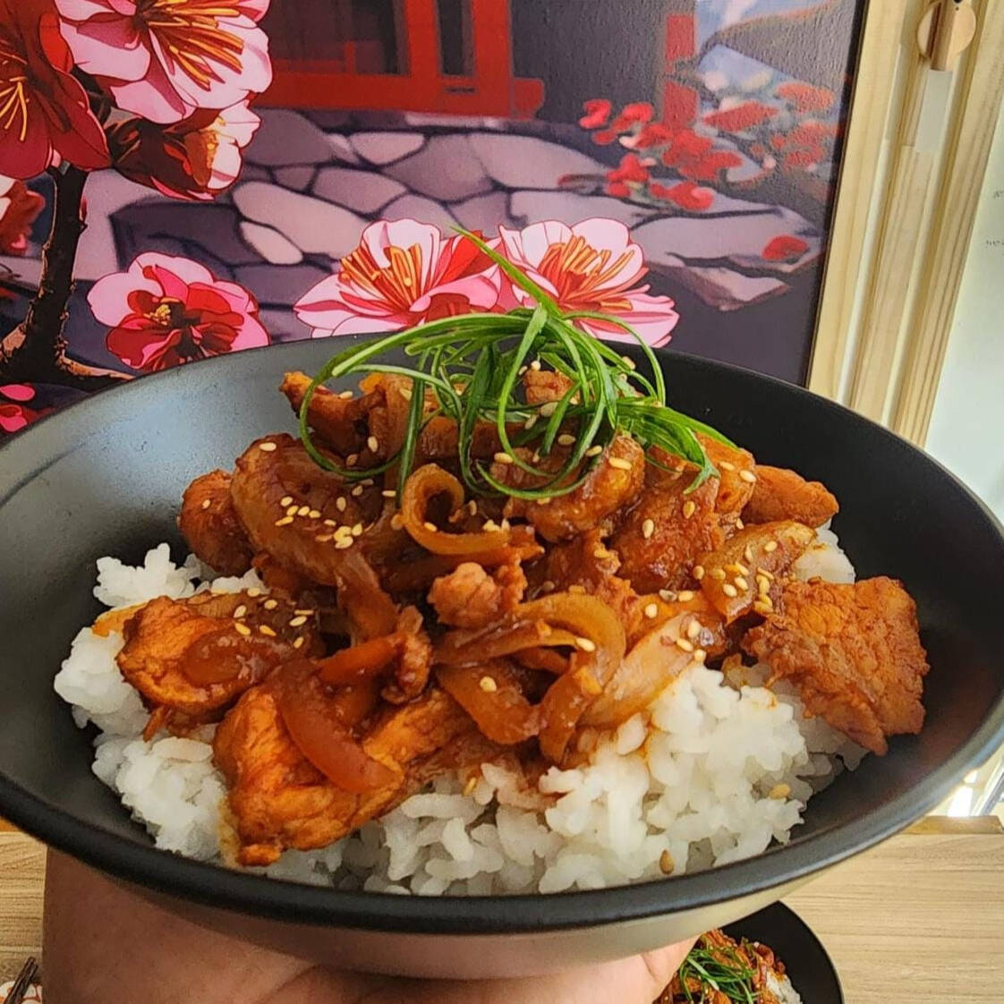 320 g De cama de arroz al vapor y 280 g deliciosa carne de res dulce sazonada con los más exquisitos ingredientes orientales, coronado con cebollín y ajonjolí. ¡Te volará la cabeza!
