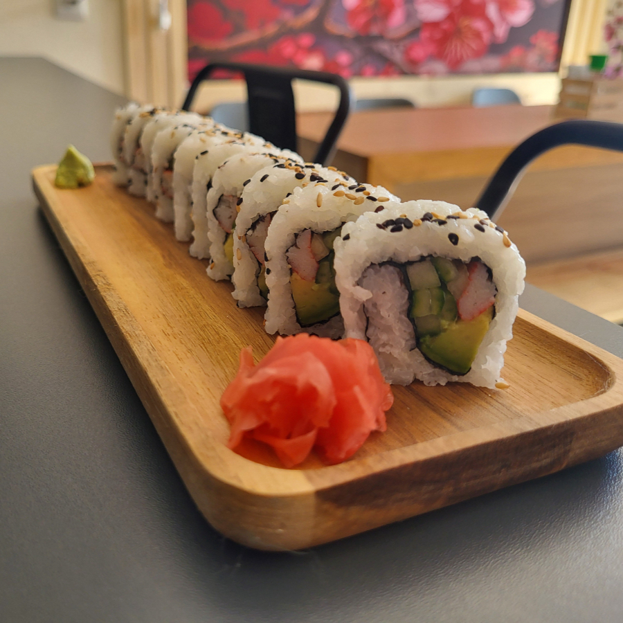 Arroz por fuera y ajonjoli, surimi, aguacate y pepino por dentro.