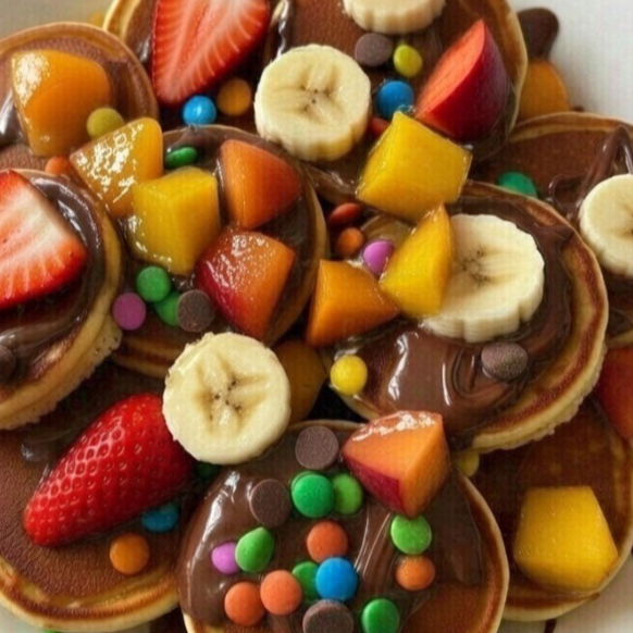 Doce mini hotcakes recién hechos. Incluyen 2 toppings y 2 untable a elección. Perfectos para compartir 🥞