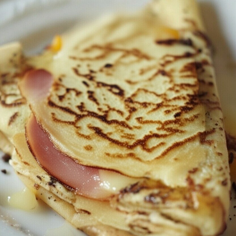 Crepa recién hecha, doradita y suave, rellena de jamón y queso derretido, ideal para un antojo salado delicioso 🤍