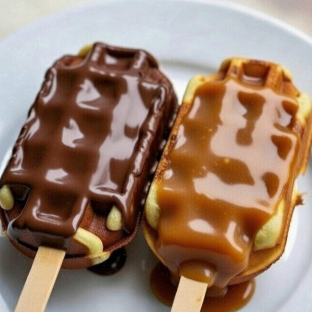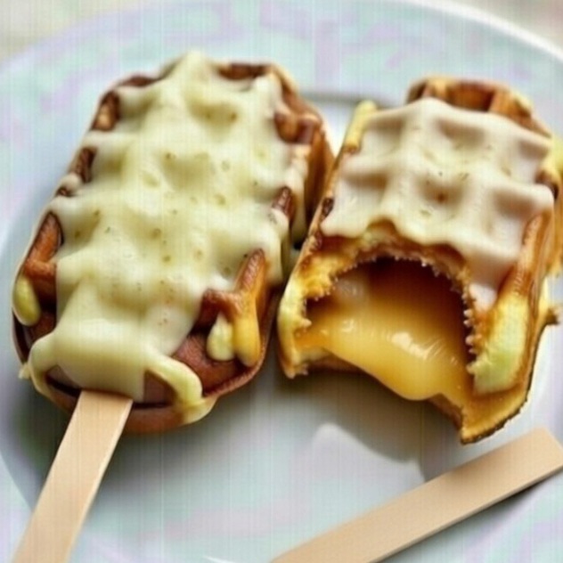 Paleta de waffle recién hecha, con un toque crujiente y sabor irresistible. Relleno con queso y salchicha. ideal para quienes prefieren algo salado.