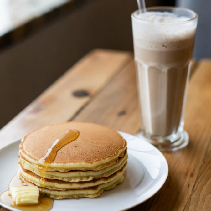 Disfruta de 3 Hotcakes Clásicos recién hechos, suaves y esponjosos, acompañados de 1 Malteada de Vainilla de 16 oz.