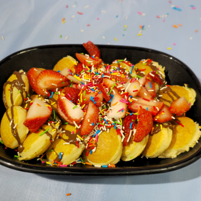 Dieciocho mini hotcakes suaves y calientitos. Incluyen 3 toppings y 3 untable a elección