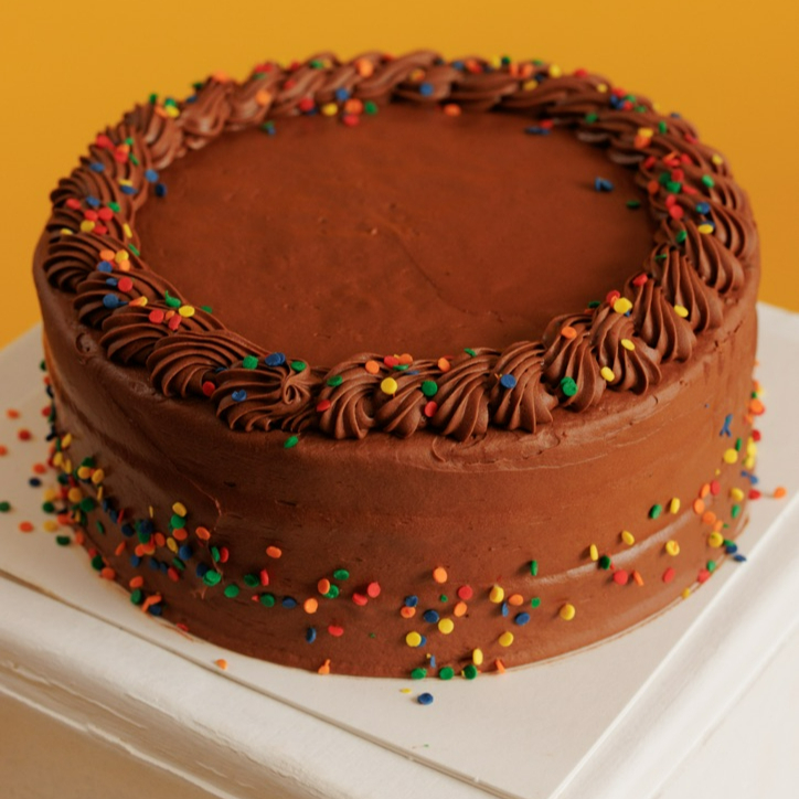 Pastel de vainilla humectado con jarabe dulce, relleno y cubierto con betún Chocolate y decorado con chispas de colores por dentro y por fuera.