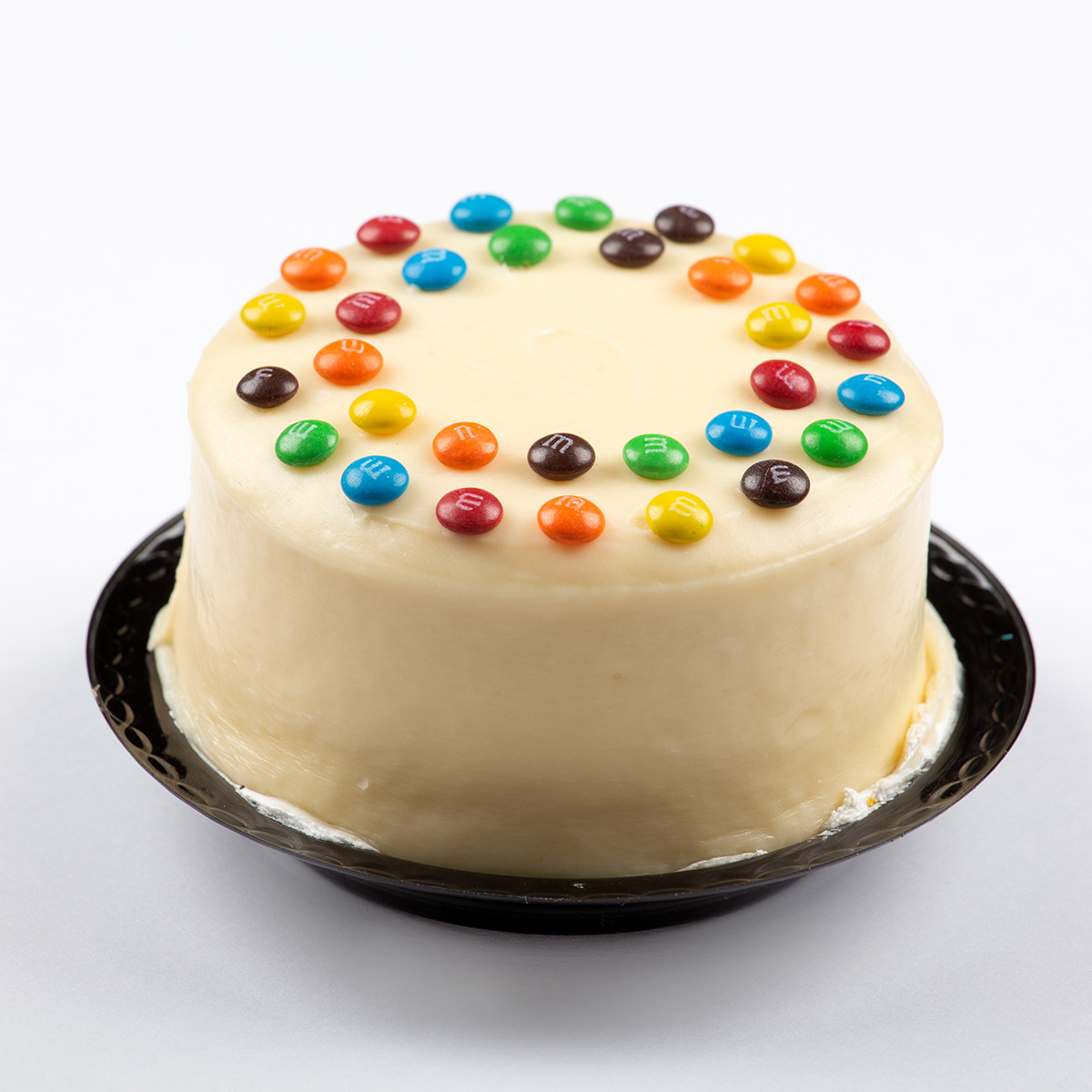 Pastel de vainilla relleno de betún de queso crema cubierto con chocolate blanco y m&m’s.
