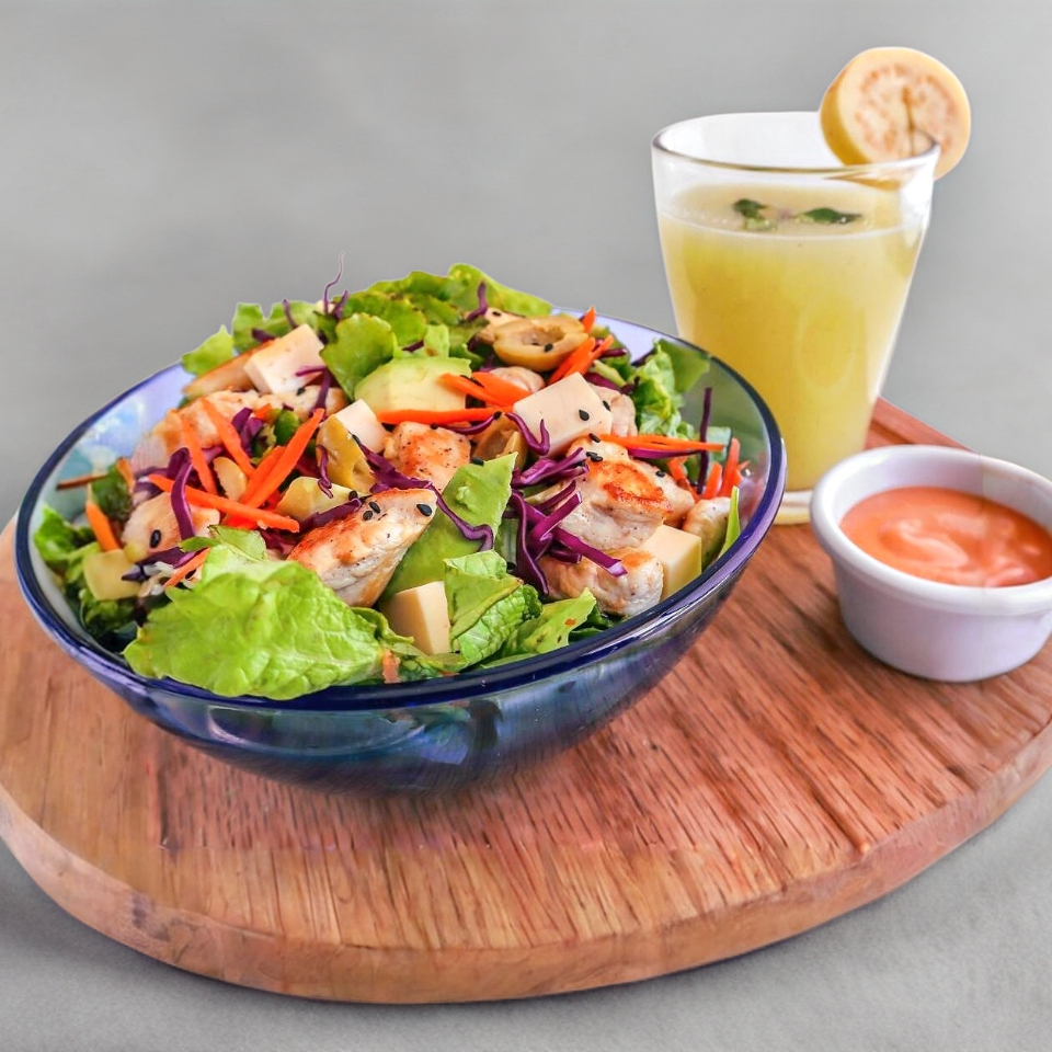 Pollo o arrachera, espinaca, lechuga, zanahoria, aceitunas, queso chihuahua, aguacate y col morada