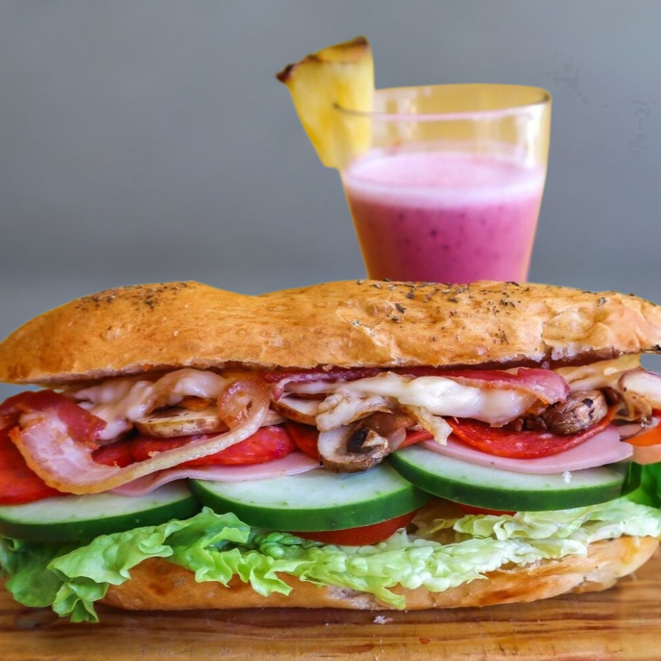 Pepperoni, jamón, tocino, champiñones, queso, lechuga, jitomate y pepino