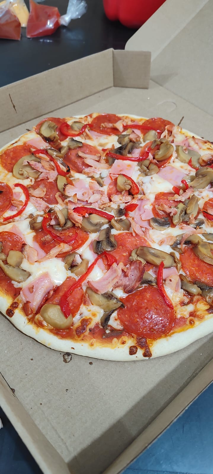 Jamón, pepperoni, champiñones, tocino, pimientos y extra queso.