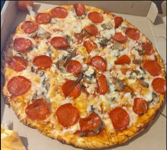 Nuestra famosísima Pizza clásica incluye frescos champiñones acompañados de una base de extra queso y pepperoni alrededor (Pizza de 35 cm y ocho rebanadas acompañados de salsas catsup y salsa chimichurri)