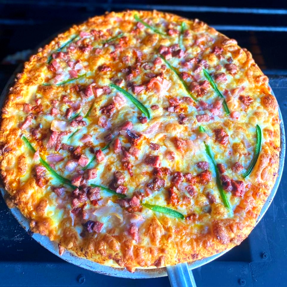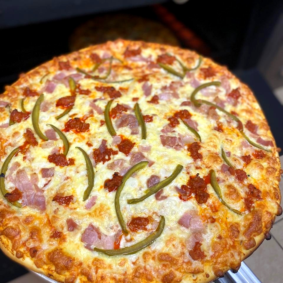 Esta pizza es única ya que tiene una cama de frijoles mezclados con nuestra inigualable salsa para pizza acompañado de doble porción de chorizo tocino jalapeño y extra queso Pizza de 25 cm y ocho rebanadas acompañados de salsa catsup y salsa chimichurri