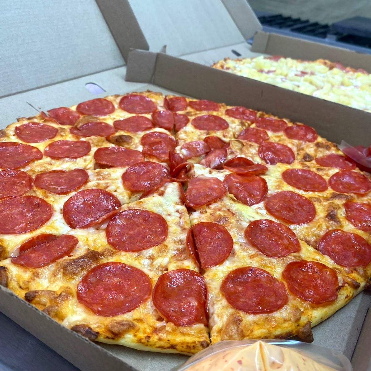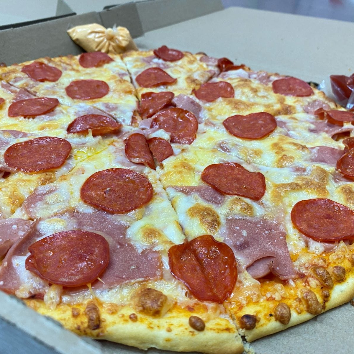 1 Pizza de pepperoni con extra queso en tamaño Grande de 35 cm y 8 rebanadas acompañada de salsa catsup y salsa chimichurri