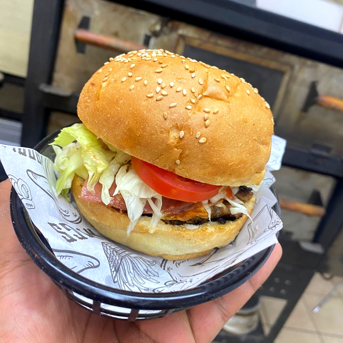 Deliciosa hamburguesa de carne de res acompañado de jamón queso blanco queso amarillo lechuga jitomate catsup mayonesa y aderezo de mantequilla dando un total de 250gr aprox. De puro sabor