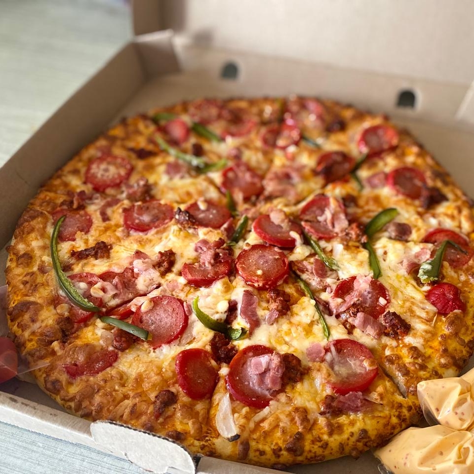 Una favorita que no se queda atrás nuestra Pizza Regia es la perfecta combinación entre arrachera de res, chorizo, tocino, jalapeño y extra queso (1 Pizza de 35 cm y ocho rebanadas acompañado de salsa catsup y salsa chimichurri)