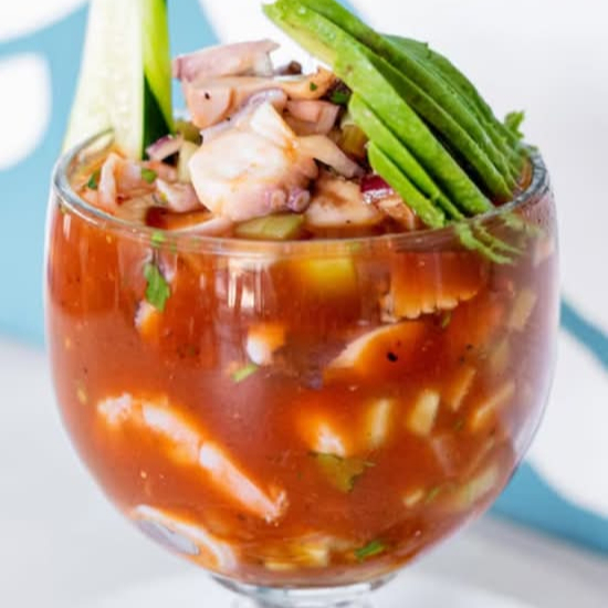 Cóctel preparado con camarón grande, aguacate, cebolla morada, pepino, limón, salsa preparada de tomate, jugo clamato, se acompaña de galletas saladas y tostadas.