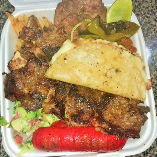 Combinación carne asada, salchicha parrillera, cebollitas, acompañados quesadilla, guacamole chico, limón, salsa chilena y roja.