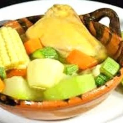 Consomé calentito con pieza de pollo, elote, verduras cocidas (zanahoria, calabacita, brócoli, repollo), acompañado de arroz, tortillas, limón, cebolla morada y salsas de la casa.