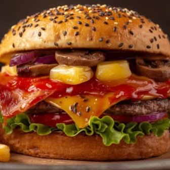 Pan brioche, jugosa arrachera a la parrilla, salchichas, tocino, champiñones, piña, extra quesos, aderezo mil islas, tomate, cebolla morada, aderezos, papas fritas y 1/2 agua de fruta natural.