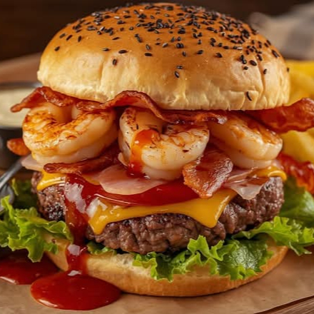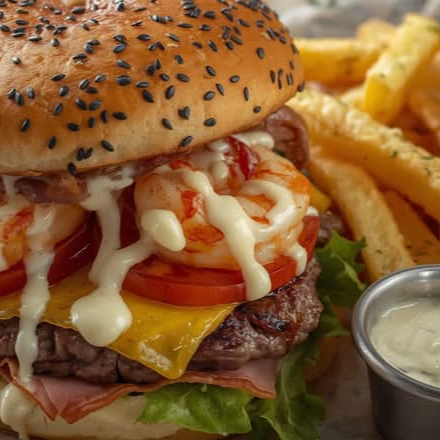 Pan brioche, jugosa milanesa a la parrilla, camarón con extra quesos, jamón, tocino, lechuga, tomate, pepinillos, aderezo mil islas, papas fritas y 1/2 agua de fruta natural.