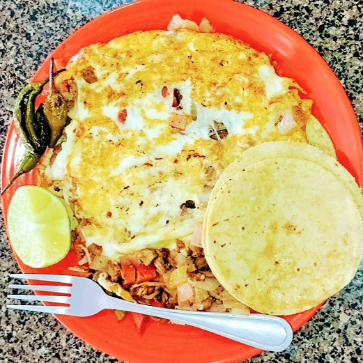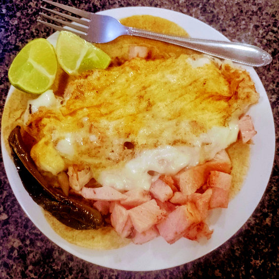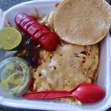 Especialidad con carne asada, chorizo, cebolla, tocino, jamón, salchichón parrillero, morrón todo envuelto en extra queso, se acompaña de frijolitos charros chicos, tortillas, limón, salsa chilena, roja y 1/2 agua de fruta natural.