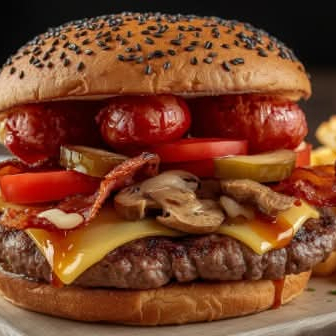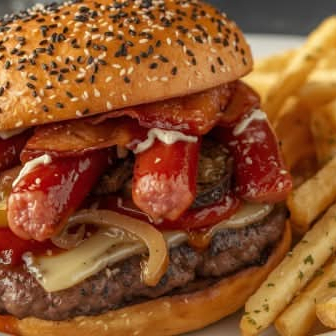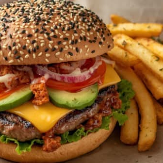 Pan brioche, jugosa carne a la parrilla, tocino, extra quesos, chorizo, rodajas de jalapeño, tomate, cebolla morada, mayonesa, cátsup, mostaza, aderezo, chimichurri, papas fritas y 1/2 agua de fruta natural.
