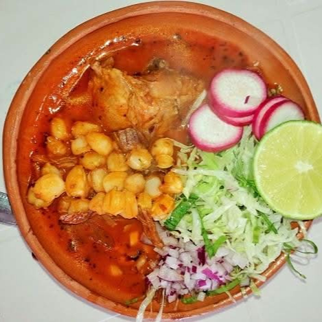 Tradicional pozole rojo con carne, maíz blanco, acompañado de lechuga, rabanitos, cebolla morada, limón, crema, tostadas y salsa picante.