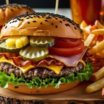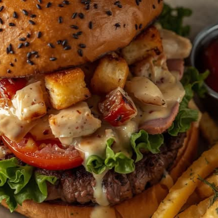 Pan brioche, jugosa carne y camarones a la parrilla, jamón, extra quesos, lechuga, tomate, pepinillos, aderezo cesar, crotones al ajo, parmesano, papas fritas y 1/2 agua de fruta natural.