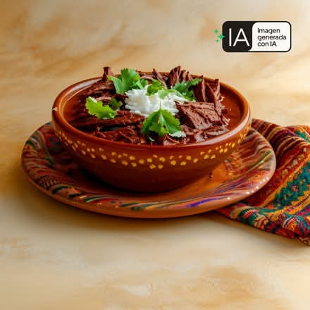 Sabrosa birria de borrego acompañada de consomé y salsa de tomate, chile rojo, cebolla morada, cilantro, limón, tortillas y frijoles charros chicos.