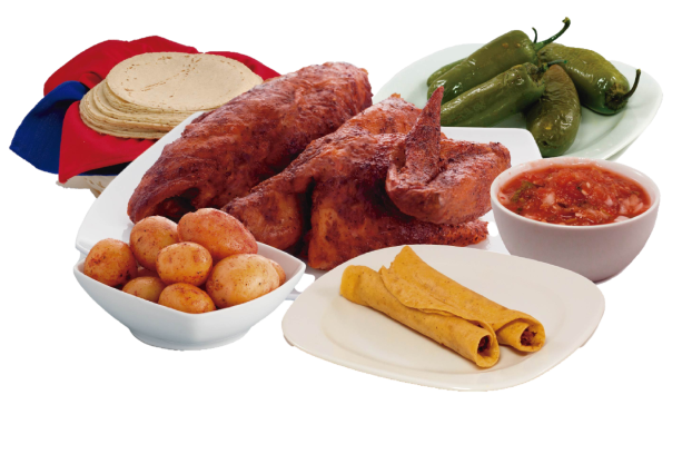 1 1/2 Pechugón, 8 Tacos, 1 Ord Papas, 1 Arroz, Chiles toreados, Salsa y Tortillas.