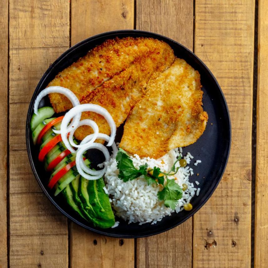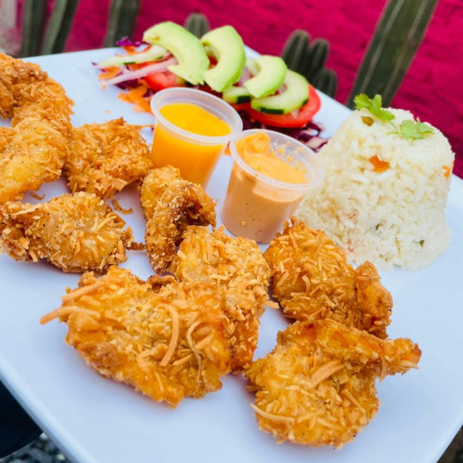 CAMARONES EMPANIZADOS, ARROZ Y ENSALADA.