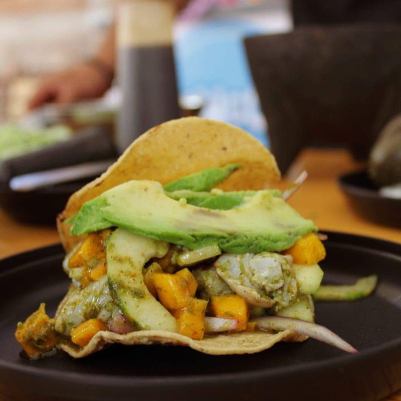 Ceviche de pescado en salsa negra con pepino, cebolla morada, jitomate.