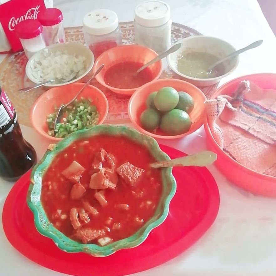 Menudo de res, cebolla, chile, limón, orégano, tajín y tortillas.