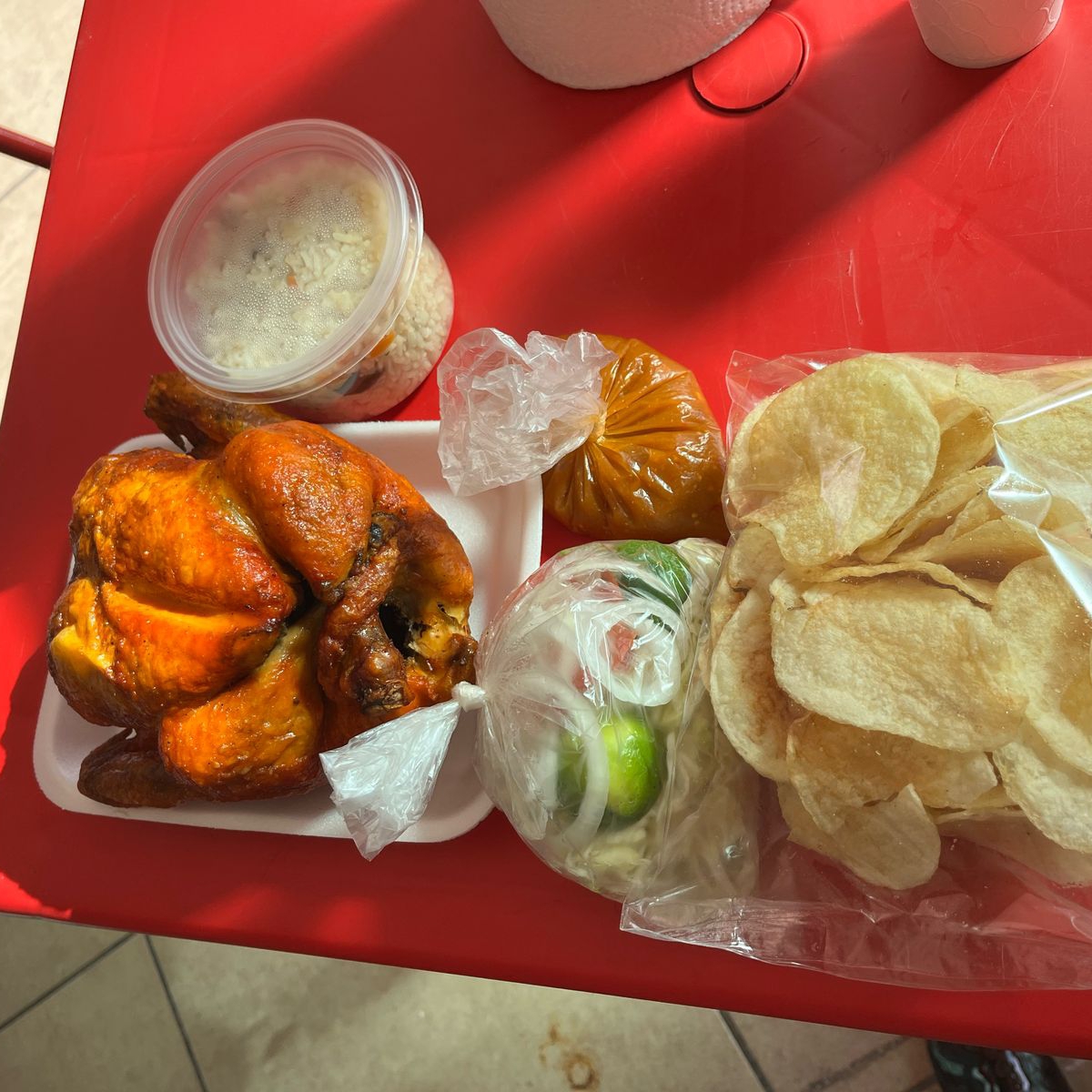 1 pollo rostizado acompañado de salsa, verdura fresca y ½ kg de tortillas.