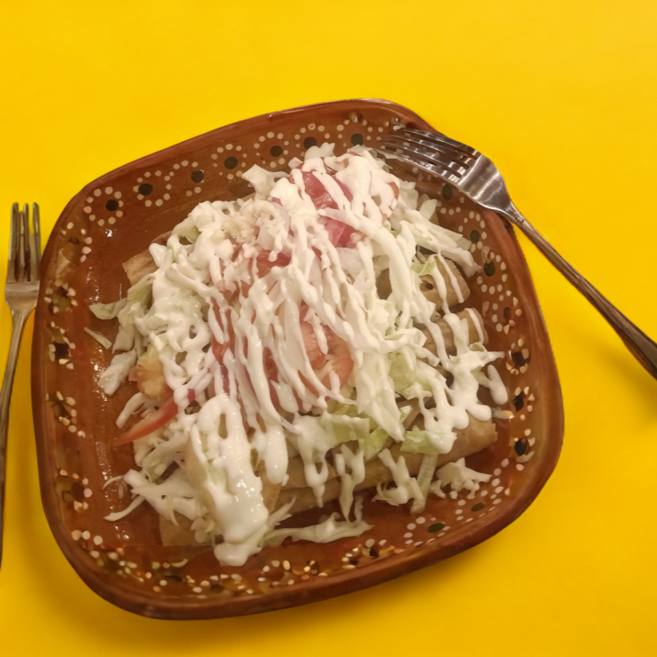 Flautas de deshebrada, 5 piezas con tortilla normal, aparte verdura crema, salsa