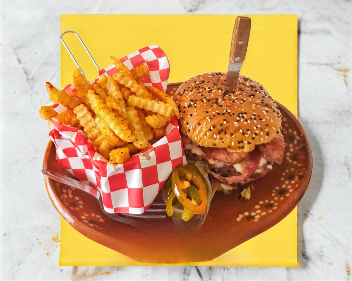 Hamburguesa tocinera, con doble carne, queso blanco, queso amarillo. papas fritas