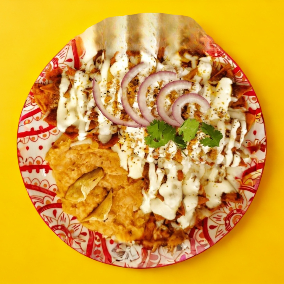 Deliciosos chilaquiles verdes con frijoles, salsa y crema