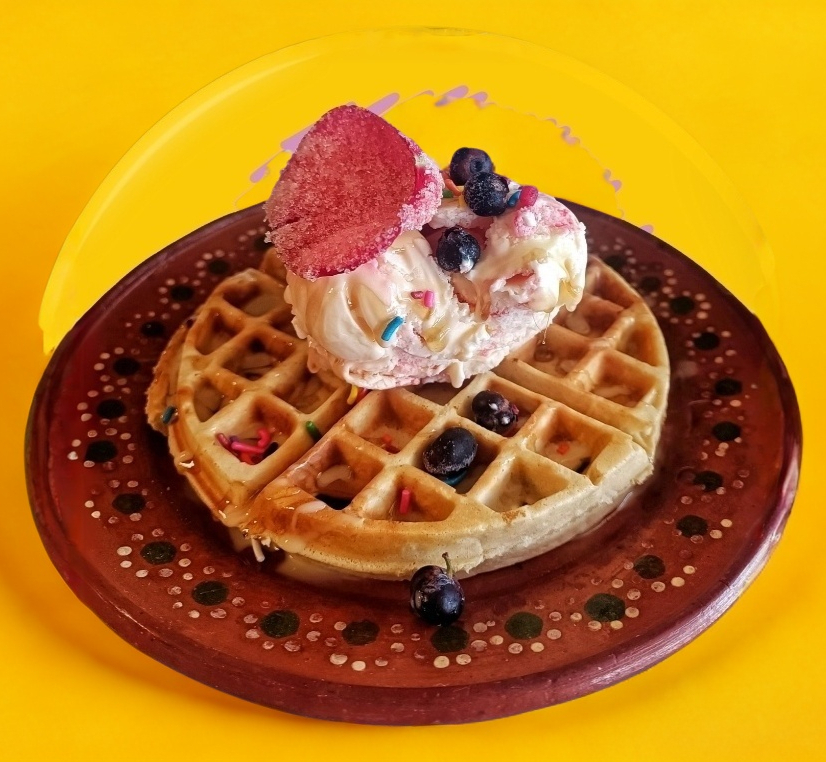 2 piezas de waffle con un topping a elegir y una bola helado
