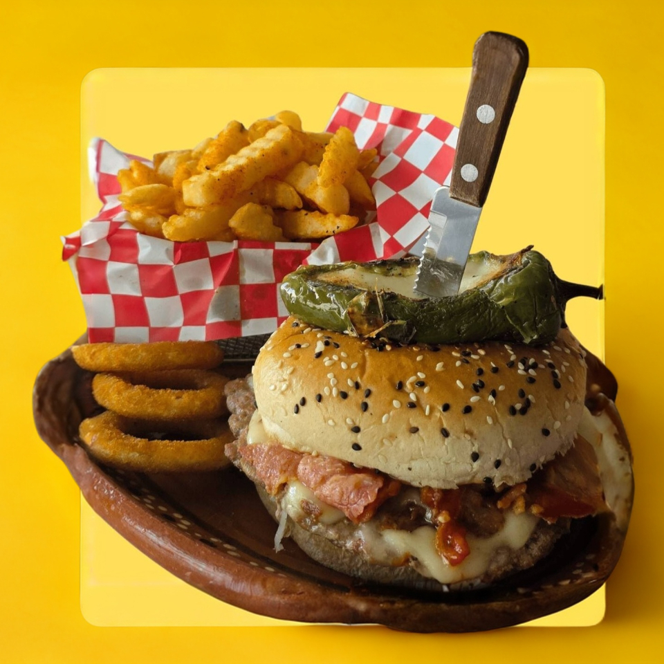 300gr Carne , queso blanco, queso amarillo, aros de cebolla, tocino, salsa bbq y chile relleno de queso.