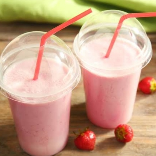 Malteada cremosa a base de helado de fresa, leche y frutas,