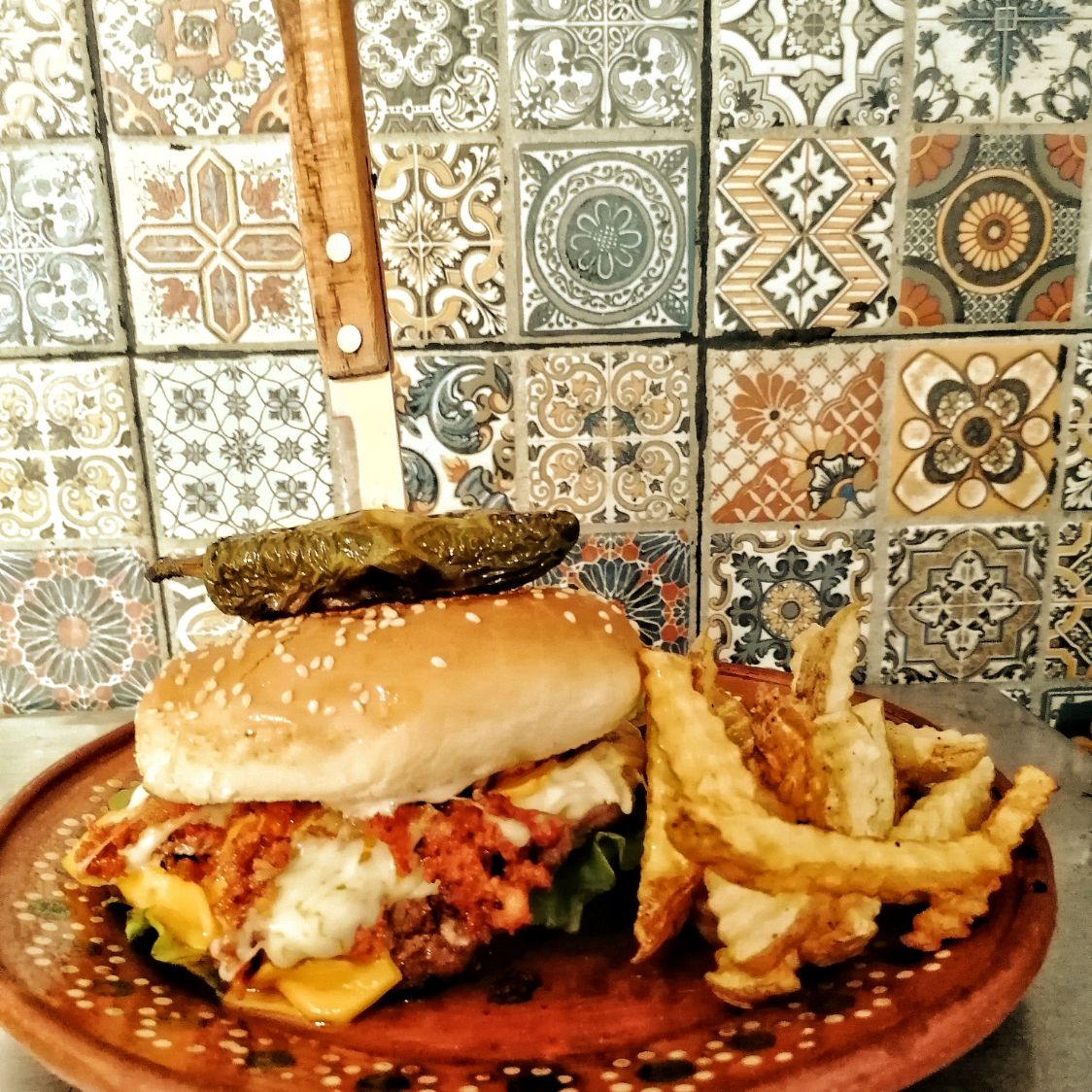 150 gr carne, queso blanco, queso amarillo, chorizo, chile relleno, acompañada de papas.