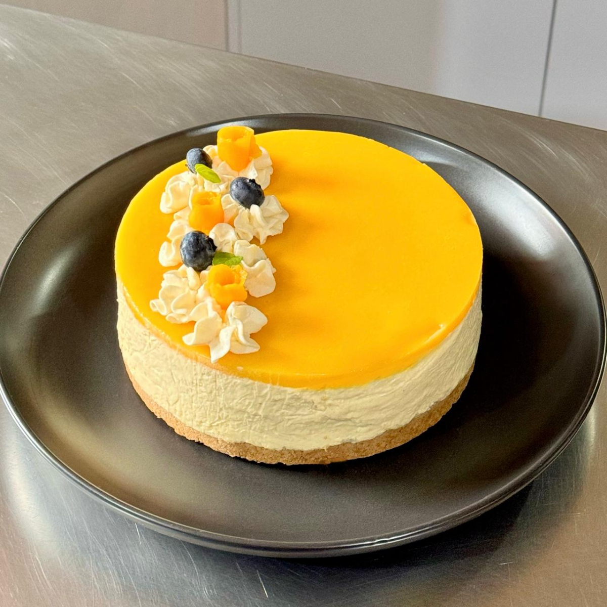 Base sablee de vainilla reconstituida, mezcla de queso crema, nata de leche, vainilla natural, mango haden, limón, namelaka de mango y mousse de chocolate blanco con fresas frescas o blueberries. 5 Porciones.