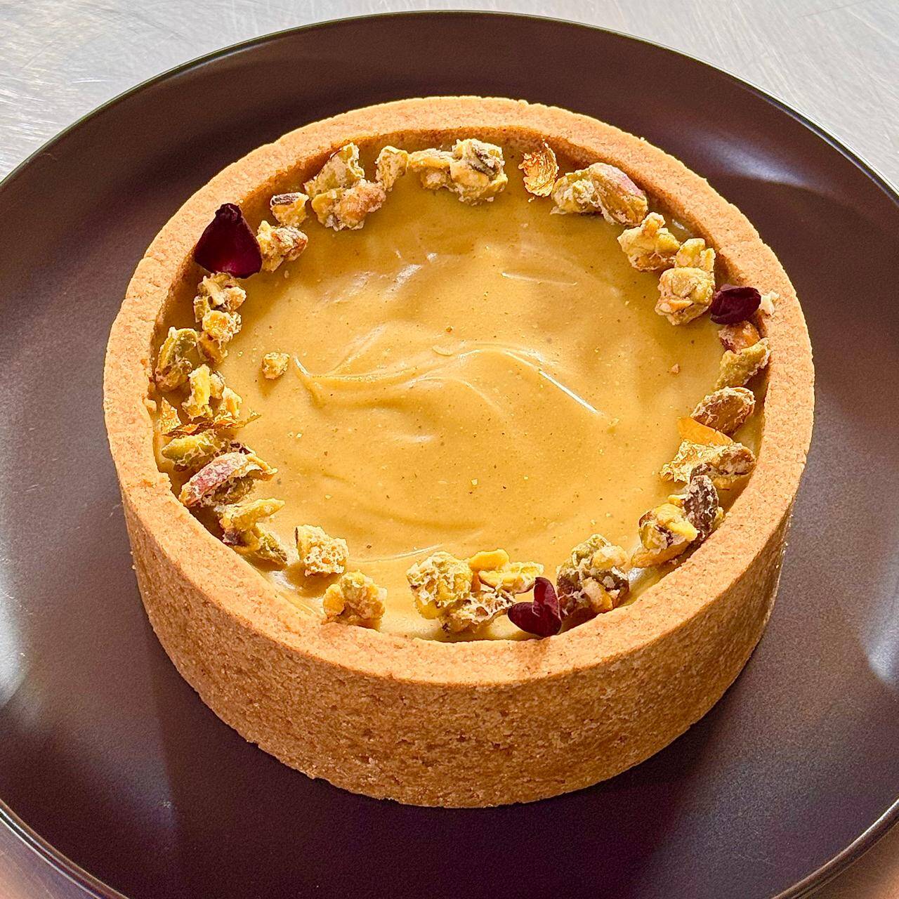 Base sablee reconstituida especiada con cardamomo, mezcla de queso crema, nata de leche y pasta de pistacho natural, cubierto con ganache de pistacho y decorado con pistachos caramelizados. 5 Porciones