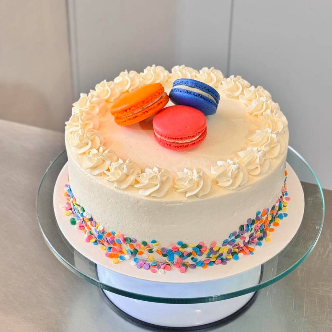 Bizcocho suave y húmedo a base de mantequilla y vainilla natural con confeti de colores comestible incrustados en el bizcocho con relleno de compota de fresa, betún de queso crema y decorado con franja de confeti de colores comestible y macarons. El color de los macarons puede variar….