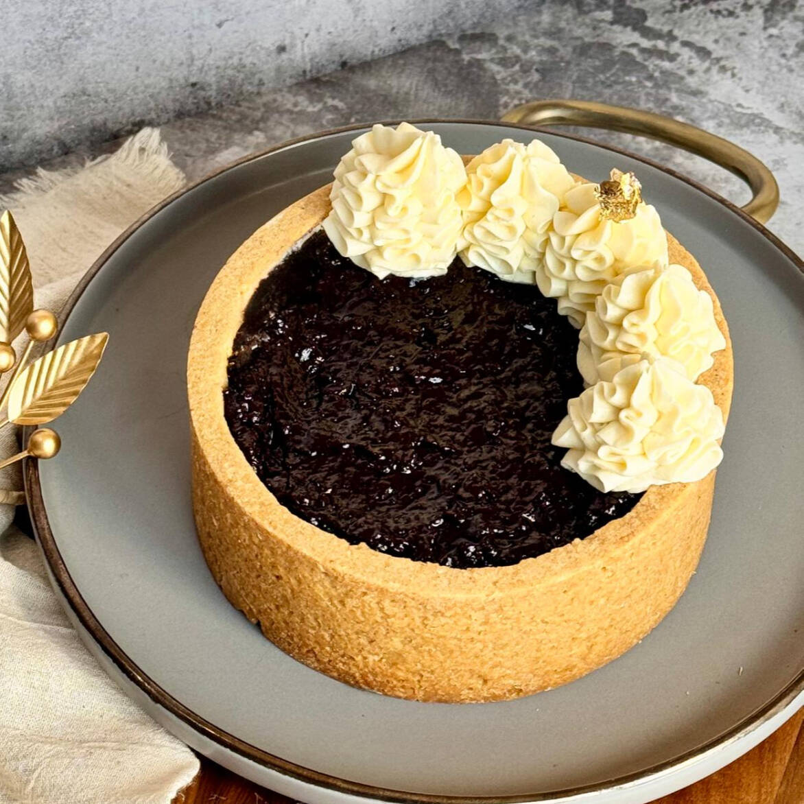 Base sablee especiada reconstituida, con cremoso relleno de mezcla de queso crema, nata de leche, vainilla natural, compota de zarzamora y relleno con ganache de chocolate blanco. 5-6 Porciones.