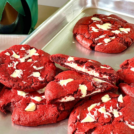 Galletas artesanales de color rojo intenso sabor a cacao y mantequilla, insert de queso crema, pasta de vainilla natural y chispas de chocolate blanco. 85g c/u Aprox, 12 Unidades.