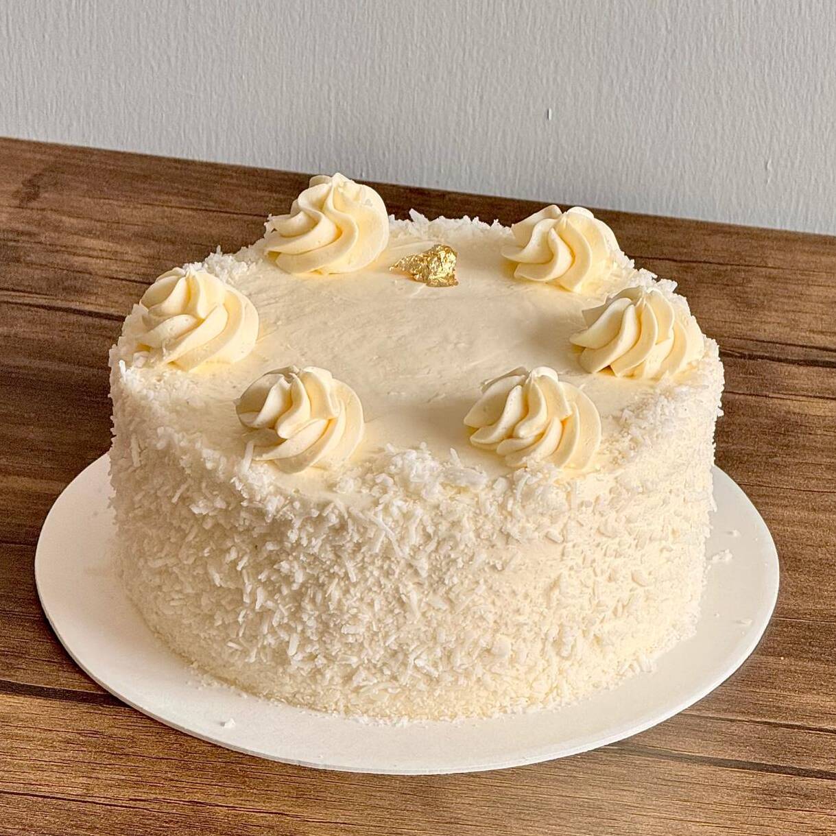 Bizcocho tradicional a base de harina de almendras y mantequilla, embebido de una mezcla de leches con crema de coco, relleno de toffee de caramelo con almendras tostadas, cubierto con ganache de chocolate blanco y decorado con coco.