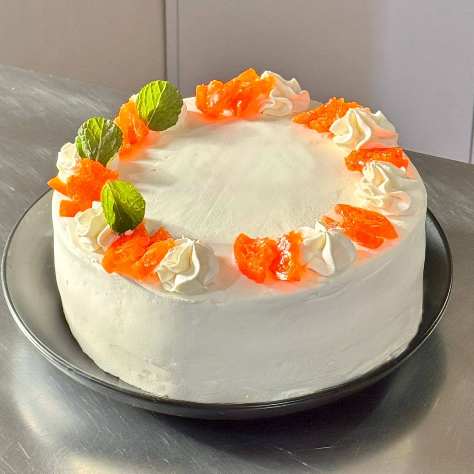 Bizcocho suave y húmedo a base de mandarina natural con mantequilla, relleno de compota de blueberries, cubierto con ganache de chocolate blanco y decorado con medias lunas de mandarinas confitadas.