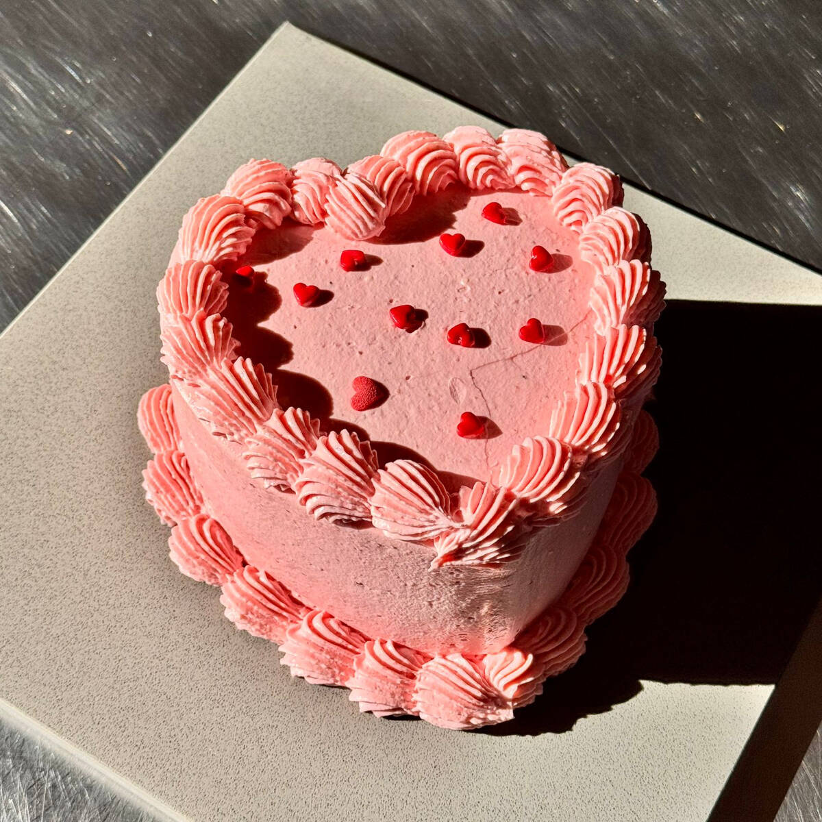 Cálido, suave y fresco bizcocho de fresa natural, relleno de jam de fresa, betún de queso crema, decorado vintage en forma de corazón. 5-6 Porciones