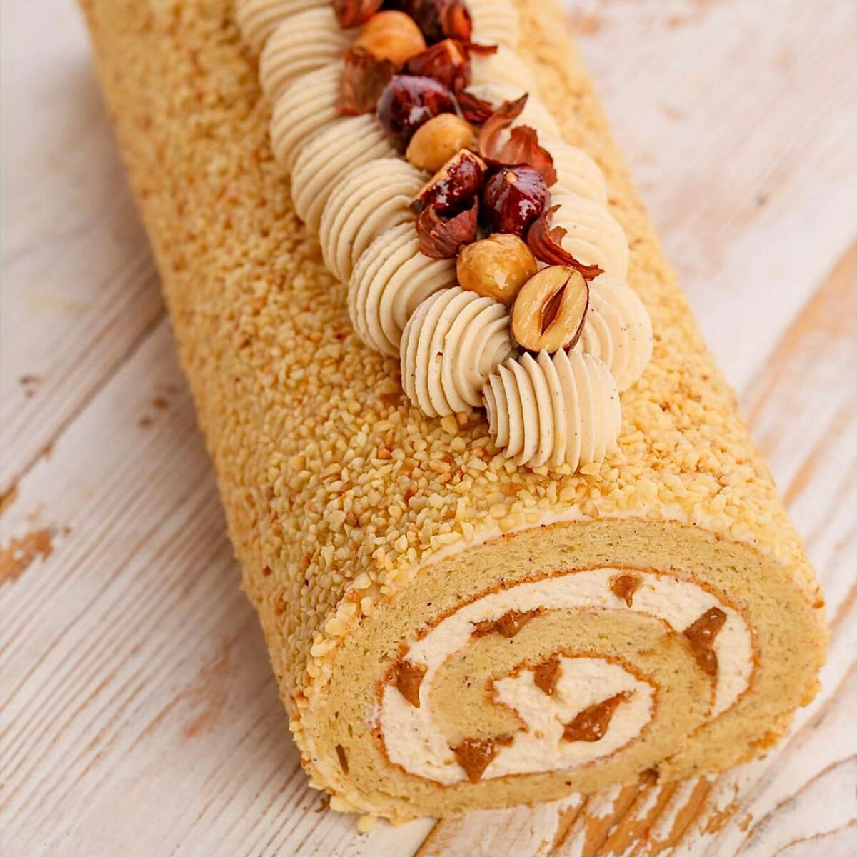 Bizcocho suave, húmedo y esponjoso 100% artesanal a base de mantequilla y harina de avellanas, relleno de ganache de chocolate de leche, praliné almendra avellana, forrado de polvo de avellanas tostadas y avellanas caramelizadas.